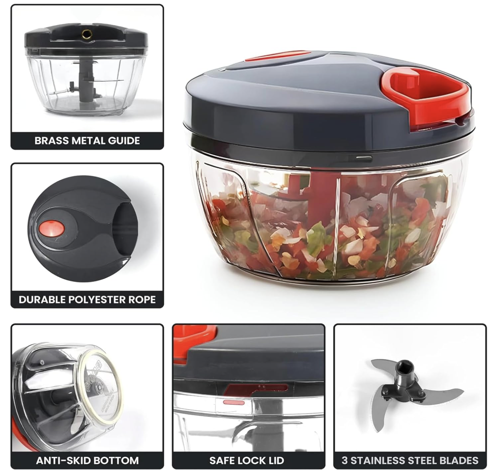 This manual hand-pull chopper comes with sharp stainless steel blades that ensure quick and effortless chopping of vegetables, fruits, herbs, and nuts. Its smooth pull-cord mechanism gives you full control over chopping consistency without using electricity, making it ideal for home kitchens, travel, and outdoor cooking. The compact 450ml capacity saves space yet delivers powerful performance for daily use. Made from BPA-free, non-toxic, and durable plastic, it includes an anti-slip base for safe and stable operation. The transparent bowl lets you easily check the chopping level. All parts are simple to disassemble, making cleaning fast and convenient—just rinse under water or place in the dishwasher. Versatile and easy to use, it’s perfect for preparing onions, garlic, chutneys, dips, and baby food.